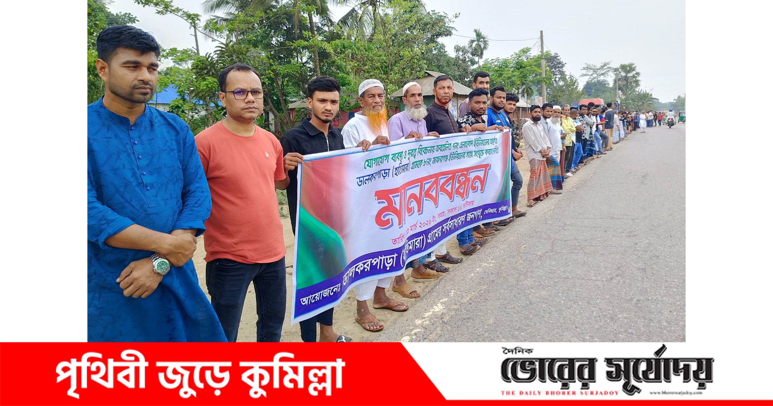 কুমিল্লার দেবীদ্বার উপজেলার ৭ নং এলাহাবাদ ইউনিয়নের ‘ডালকরপাড়া’ (হাতিমারা) গ্রামকে ৮ নং জাফরগঞ্জ ইউনিয়নের সাথে সংযুক্ত করার দাবীতে ওই গ্রামের সহস্রাধিক মানুষ রাজপথে মানব বন্ধন করেছে।