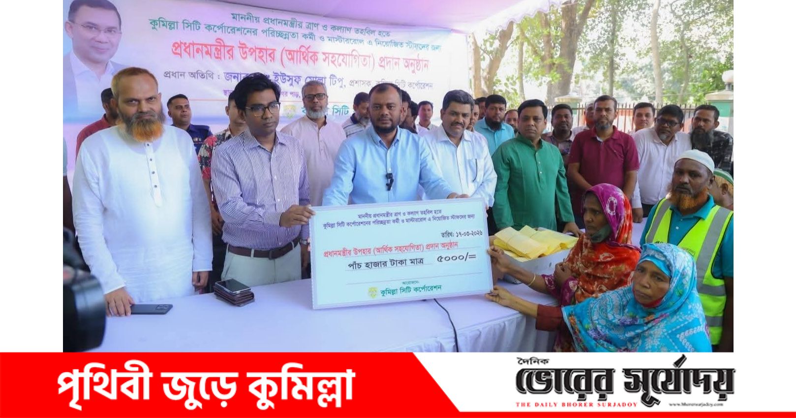 পবিত্র ঈদুল ফিতর উপলক্ষে কুমিল্লা সিটি কর্পোরেশনের (কুসিক) পরিচ্ছন্নতা কর্মী ও মাস্টাররোলভিত্তিক স্টাফদের মধ্যে প্রধানমন্ত্রীর ঈদ উপহার বিতরণ করা হয়েছে। প্রধানমন্ত্রী তারেক রহমানের ত্রাণ ও